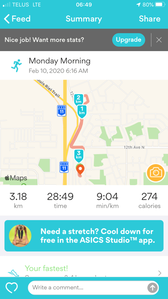 The temperature was only -8 degrees Celsius, but that was apparently cold enough to cause my lungs to seize within the first half-kilometre. Running was fairly difficult, despite the quiet streets. But as you can see from the image above, I managed 3.18 kilometres in just under 29 minutes. Not too shabby, considering how long it’s been since I ran like that.
