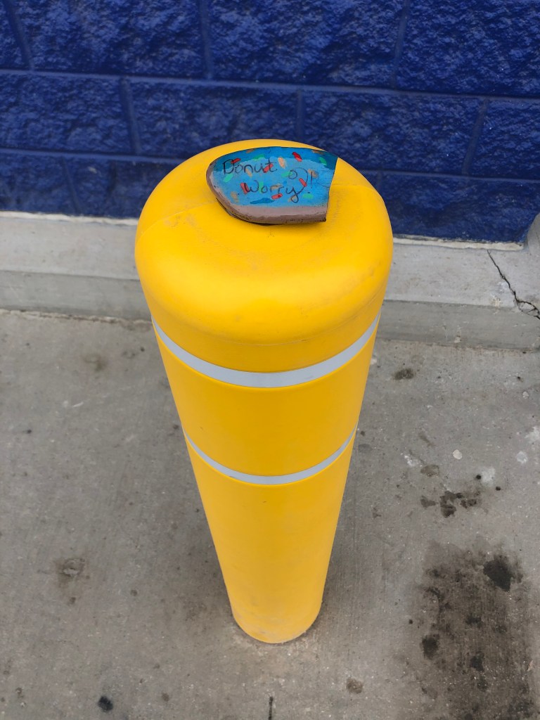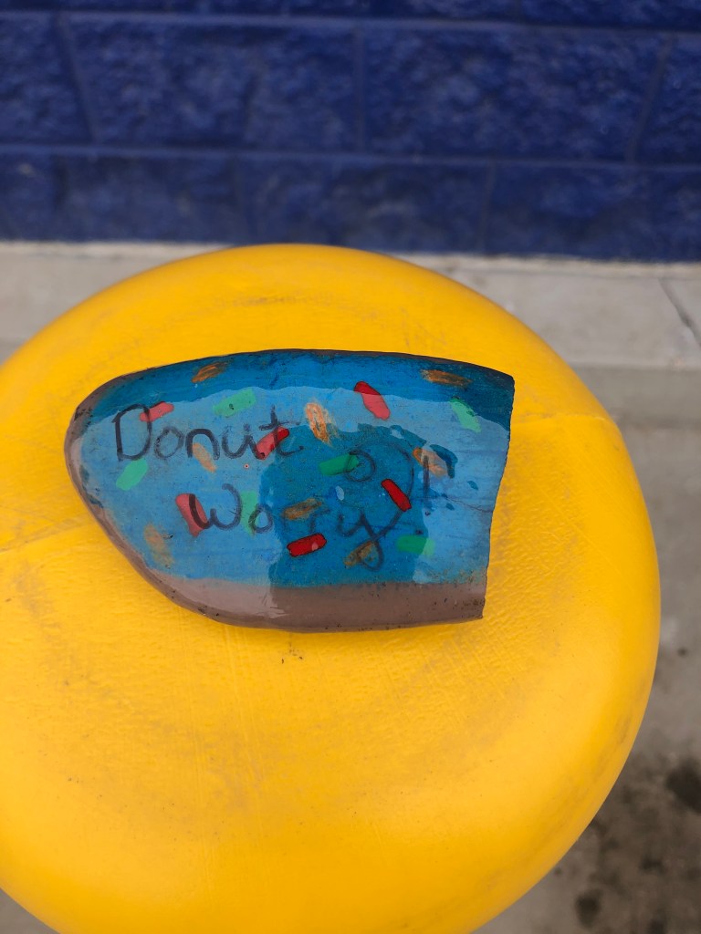Then I walked out of the retail location I was shopping in, and found something I didn’t expect: a rock! More of a stone, really. But it was painted and polished and left sitting on top of one of the concrete pillars outside the building. It caught my eye, and as I looked closely I noticed that it had the words “donut worry” painted on it.