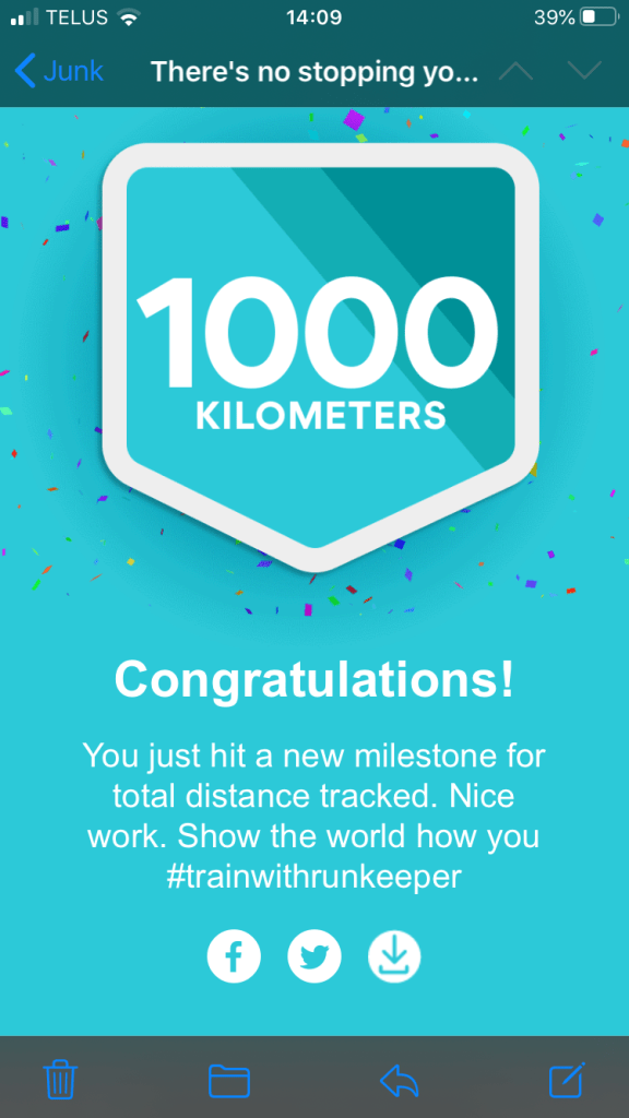 So after using yesterday’s post to bitch, whine and complain about Mother Nature’s unending use of the Prairie Provinces as her personal whipping ground with the non-stop wind, I got an e-mail from my RunKeeper app yesterday indicating that I’ve apparently hit 1000 kilometres this year!