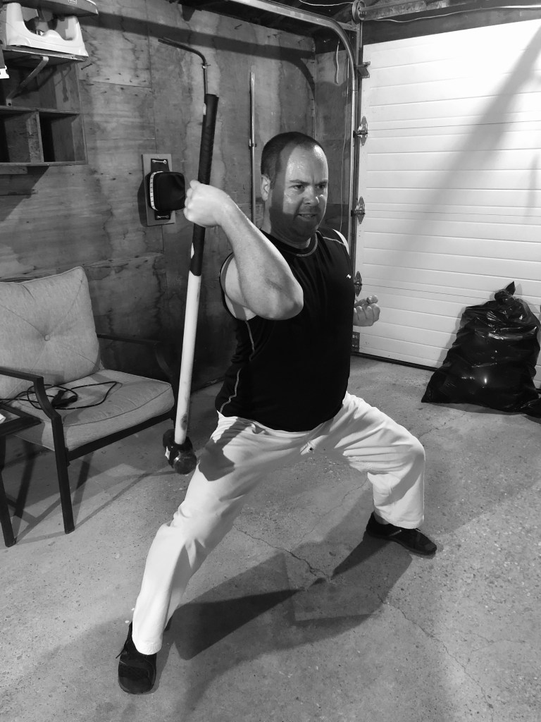 In the photo above, you see me using an 8-pound sledgehammer as a makeshift chishi. The handle of a traditional chishi would usually be shorter than the handle of a sledgehammer, so some adjustment usually needs to be made. But here, you can see me doing an exercise where I’m in a seated horse-stance position, and I’m thrusting the hammer out and bringing it back in towards my chest in repeated succession. The balance of the weight at the very top, combined with the movement of the arms, feels a bit strange at first.
