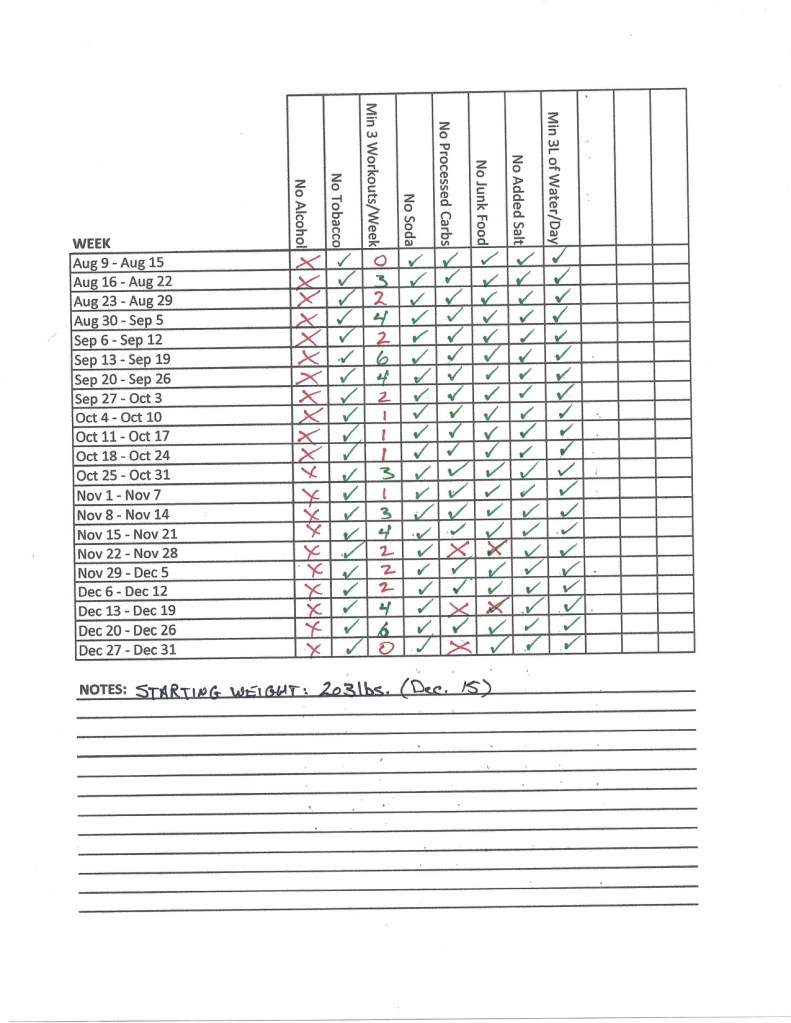 My water consumption is always within the 3 litre arena, considering all the fluids I take in throughout the day from various sources. I’ve caught myself salting certain foods lately, so I’m admitting that those green check marks aren’t all accurate. And as a wise friend pointed out several months ago, some of the food I’ve consumed is processed even if I haven’t acknowledged it as such (Thanks, Kristen!). The “No Soda” column is likely the one I was the most disciplined with. Workouts are workouts, with some weeks showing as many as 6 workouts and a few that even had none.
