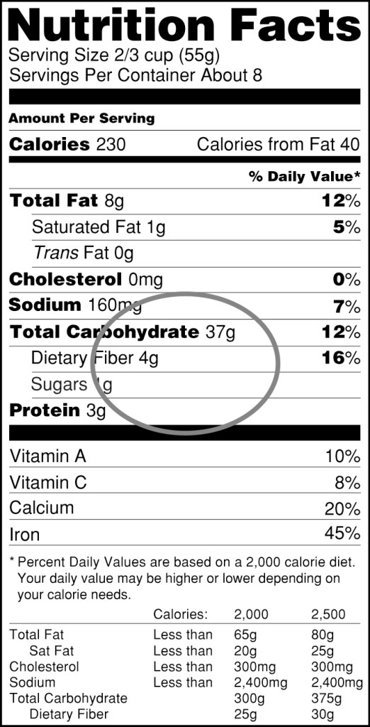 I posted about this a few years ago, but counting carbs involves a bit of math. Most commercially purchased foodstuffs will have a nutritional label on the packaging that should allow you to have a reasonable idea of how many carbohydrates you should be bolusing for. I say a “reasonable idea” because it isn’t always accurate. But what’s more is, you can’t just read the label and bolus for the carbohydrate total listed on the label. The image below will illustrate: