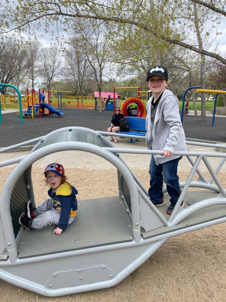 We decided to try dressing warmly and bringing the boys to candy cane park. An outdoor play park, it features a number of different ares of play, including a giant, concrete sculpture of a Canada Goose featuring all the different wildlife found around Wascana lake and has a slide and different tunnels. It a pretty fun place to play, especially since it also has a rubberized surface all over, preventing serious injury when kids tumble and fall. The idea was to let them play for a while and grab them some lunch from somewhere that they could takes bites from as they played.