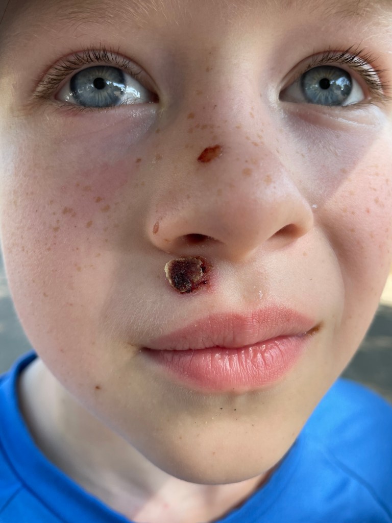 Now, don’t get me wrong… I love Nathan. He’s my first-born son, he looks like me, clings to me and watches my every move. So when I say he’s a klutz, I say it with affection albeit a mild tinge of frustration since there are so many other aspects he could have prominently at the forefront. Last week, while walking on my at-home treadmill, he wiped out. This caused him to face plant and roll on his shoulder off the edge of the treadmill’s belt. He busted open his upper lip and bruised his right shoulder pretty good.