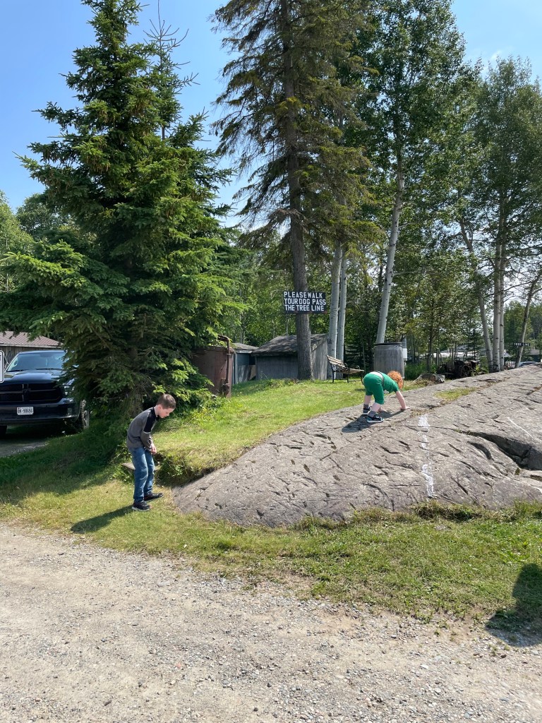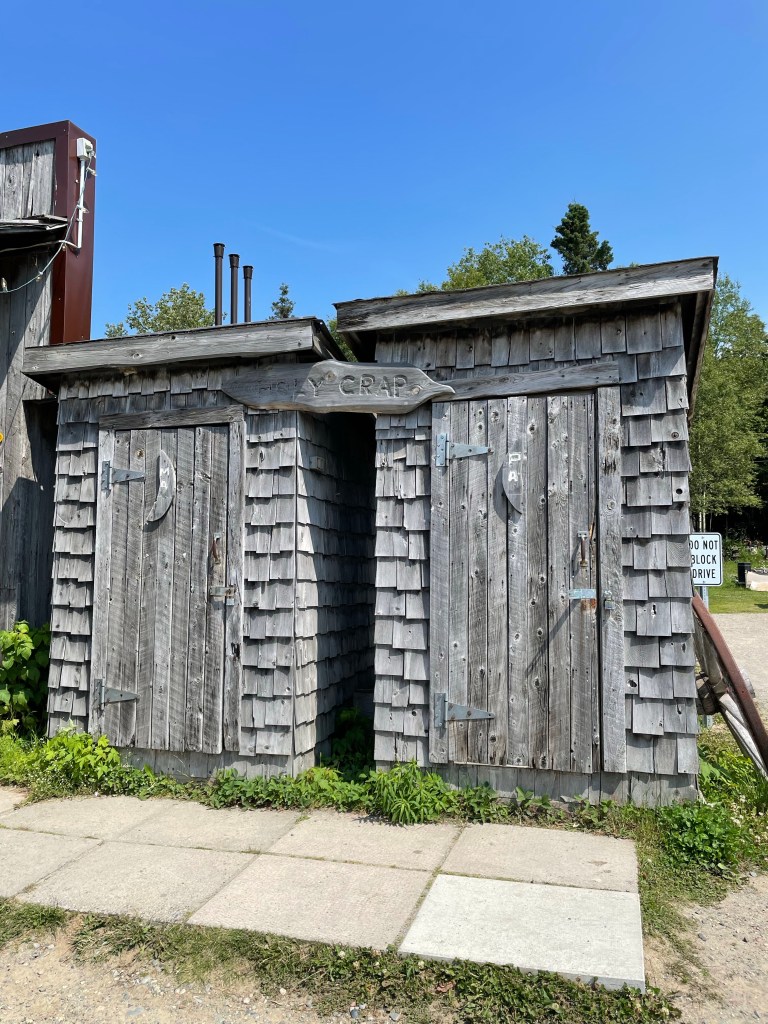 We made a few stops along the way, mostly focused on stretching our legs, getting fuel and letting the boys run around freely. One place was particularly charming, called a “Trading post” and had authentic antiquities strewn on the property and inside the store itself. We all took the opportunity to use the washrooms, especially since the washrooms were genuine, honest-to-goodness outhouses! Pictures are worth a thousand words, so please see the following photo…