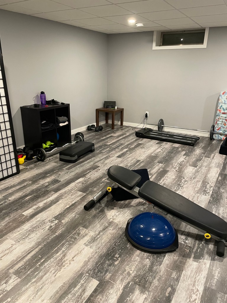 Last year, I learned that one of the benefits of my job is a flex benefit that can be used on anything fitness or health related. Although I used that flex benefit on my karate tuition last year, I didn’t need it for that this time around. Instead, I chose to use it to purchase a bunch of fitness equipment for my newly-renovated basement. As you can from the photo above, we have new flooring, newly-drywalled walls and a drop ceiling with recessed lighting. A full bathroom with a standup shower is included. Listen to me, I sound like I’m advertising my basement for rent.