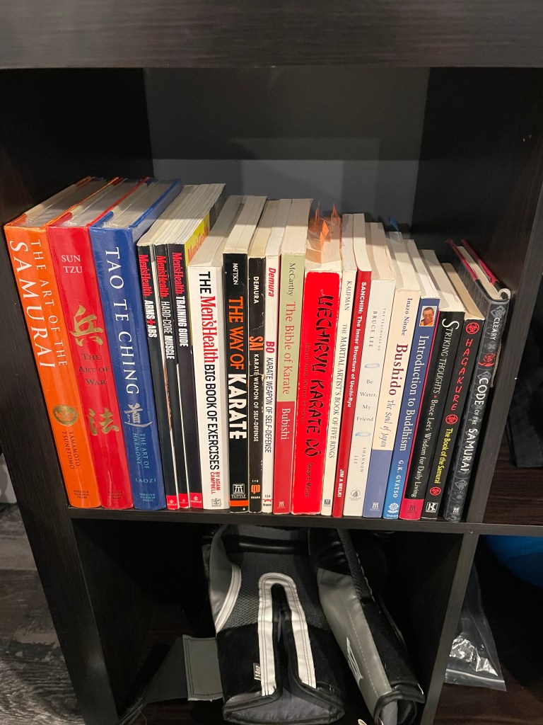 I keep a varied library of training books, as seen in the photo above. Some are a bit more on the philosophical side, such as Bruce Lee’s “Striking Thoughts.” The first three books on the left are the ones I got for Christmas that I wrote about in a previous post. Despite the philosophical nature of these books, they still contain knowledge and lessons that can be valuable to a martial artists. As I write this, I notice that my copy of the Book of Five Rings ins’t there! Where the fuck did I put that thing…? But I digress…