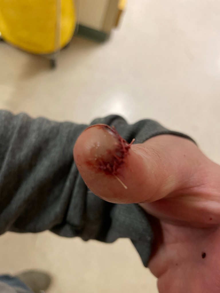 Since I’m not writing this post to brag about my culinary skills or lack thereof, you should reasonably assume that something went wrong. I was using a small cutting board and slicing up my mushrooms, when some random kids came running up my driveway. Since both my kids were inside, the movement drew my attention, both because of my hyper vigilance that I believe will never go away and my ADHD. The problem is I was in mid-slice when I turned my head. The result was a very new and very sharp chef’s knife slid across the tip of my thumb.