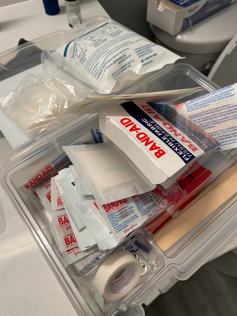 I staggered to the bathroom and opened up our home first aid kit (pictured above). Despite the cost for this thing, I was disappointed at the lack of bandages and gauze contained within. Maybe I should have looked at the included materials a bit more closely before buying it. There were only two, small gauze bandages, which I bled through and turned scarlet within seconds. After 15 minutes of consistent bleeding with no end in sight, I made my peace with the fact I would need to visit the ER…