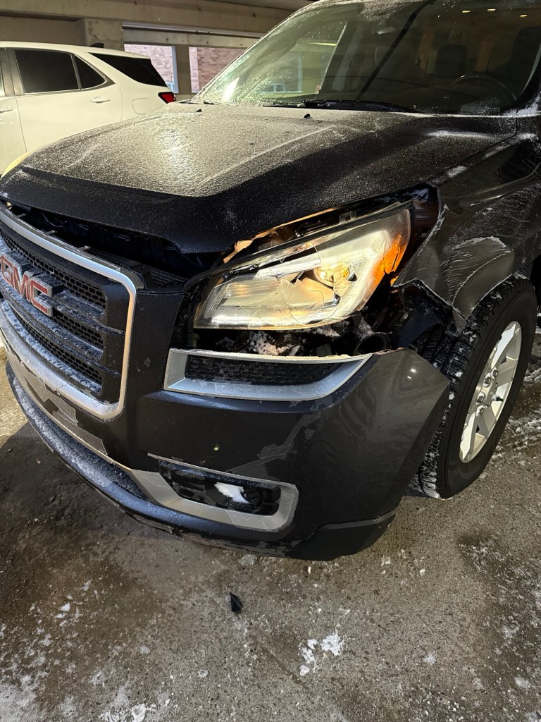 About an hour AFTER my last post, I checked out of my hotel and made my way to my vehicle. Because of the inclement weather, I had taken our SUV, which is our usual family vehicle. I was parked in an unfamiliar area of the hotel’s parkade, and my driver’s side was flush against a concrete pillar. As I was backing out, I had my eyes aimed towards the passenger side in order to avoid the other parked cars. I cut my wheels too early and the front driver’s side corner of my vehicle “kissed” the concrete pillar. Under normal circumstances, it likely would have caused some dents, scraped some paint and maybe cracked a few parts. But given that it was -35 degrees Celsius and colder than the devil’s balls, the fiberglass fender shattered like a cheap chandelier. The front driver’s side bumper, fender and headlight were damaged. Upon initial inspection, everything was solidly fastened in place and I felt confident that the vehicle could be driven safely. I took the road towards Regina. Here’s a pic of the vehicle…