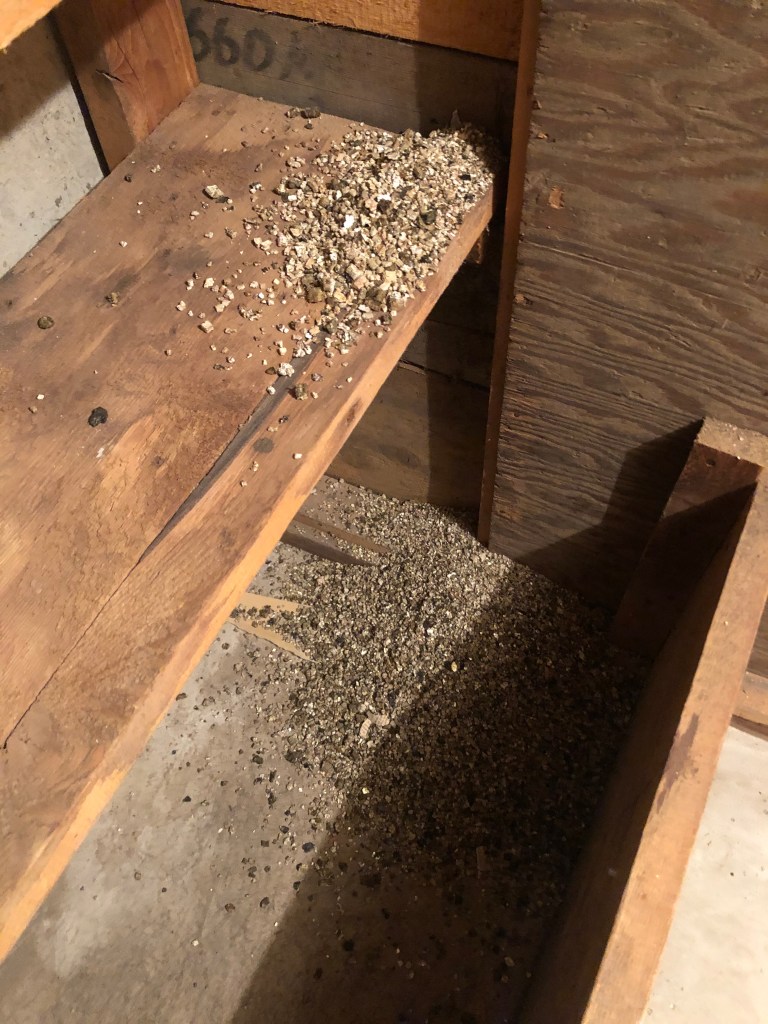 After two full days of demolition, they had about 90% of the basement demolished and on Thursday afternoon, Jeff (the owner of the company) brought me to the basement to show me that they had discovered the inner walls of our cold storage room filled with an asbestos insulation called Vermiculite. The tiles left under that wonderful orange carpet of the basement’s open area were also made of asbestos. This meant that demolition and bracing would need to stop until I could get professionals to come in and remove the asbestos.