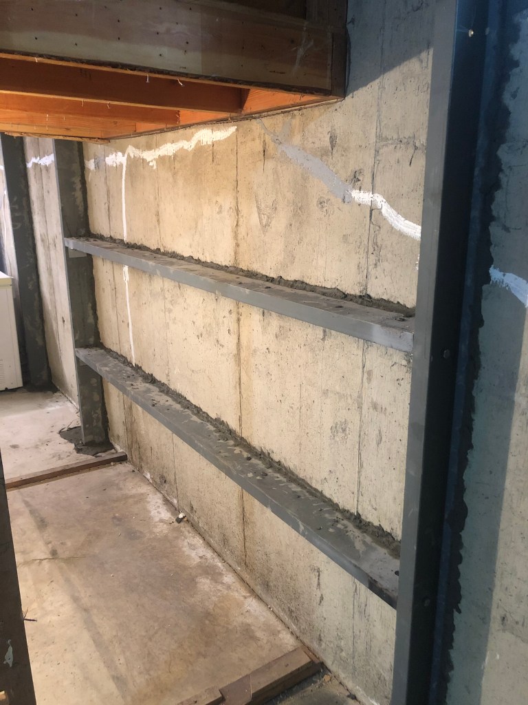 The Grasshopper crew worked over the days that followed, and I watched the progression of a heaved, cracked foundation to the neat, sealed and braced walls you see in the photograph above. A plumber and an electrician came in to reconnect certain pipes and power lines that had to be removed for the proper installation of the steel braces. All in all, the basement is looking way better than it did a month ago.